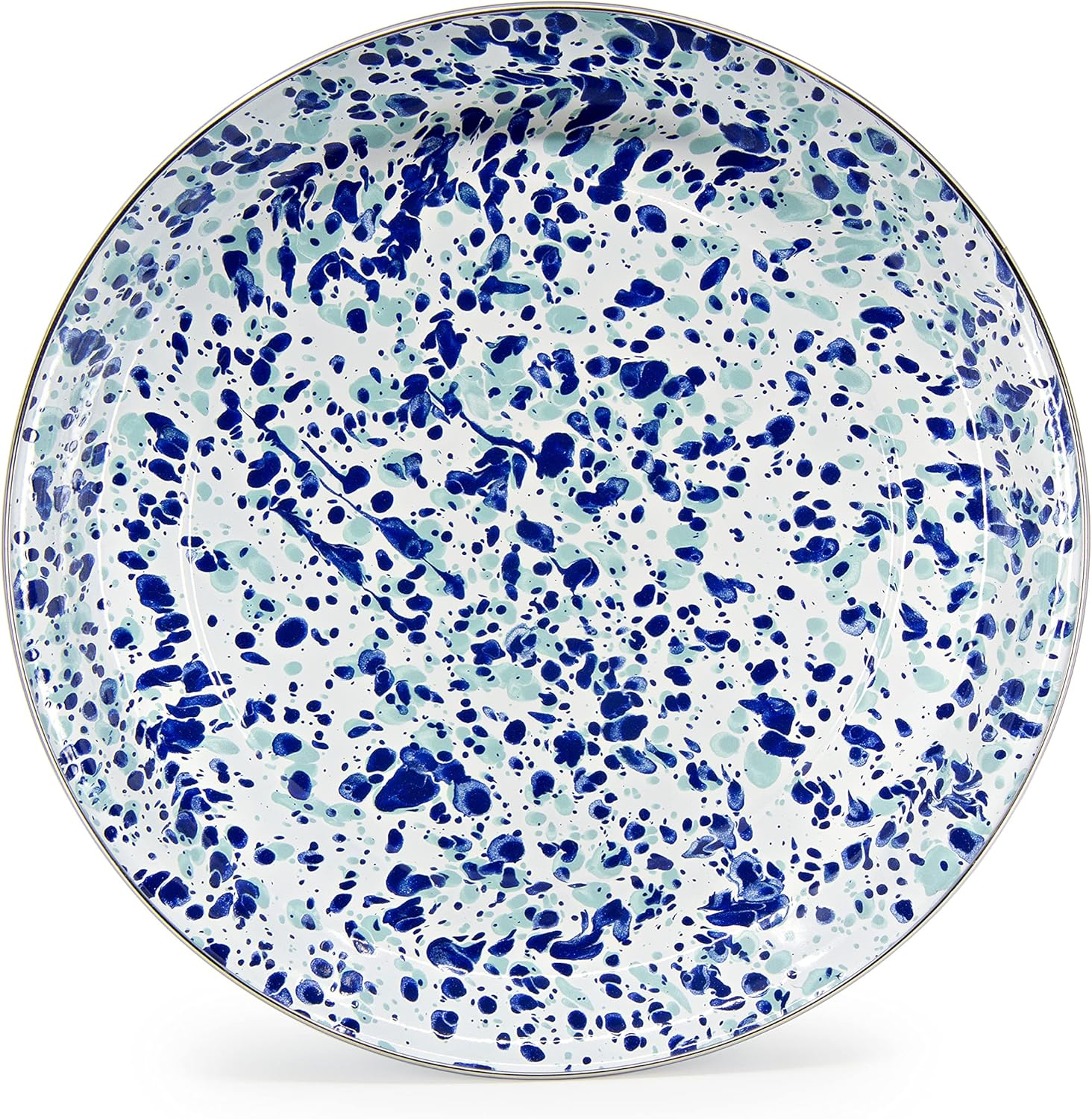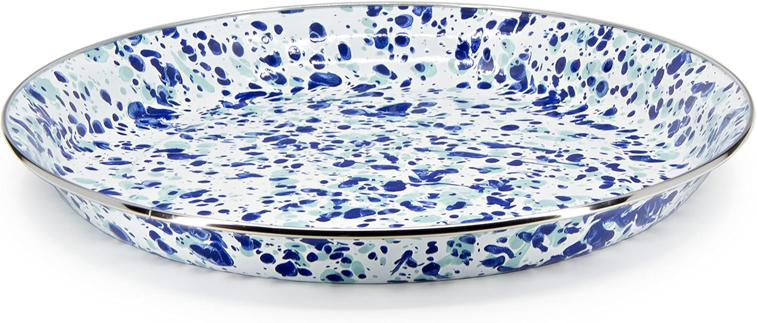 The item is a Golden Rabbit ocean swirl small tray. It’s 12 inches in diameter and 1.25 inches in height. The tray is made of steel with an elegant porcelain enamel finish. The stainless steel rim ads extra durability. Its oven and stove top safe, works with induction and is dishwasher safe and non-toxic.