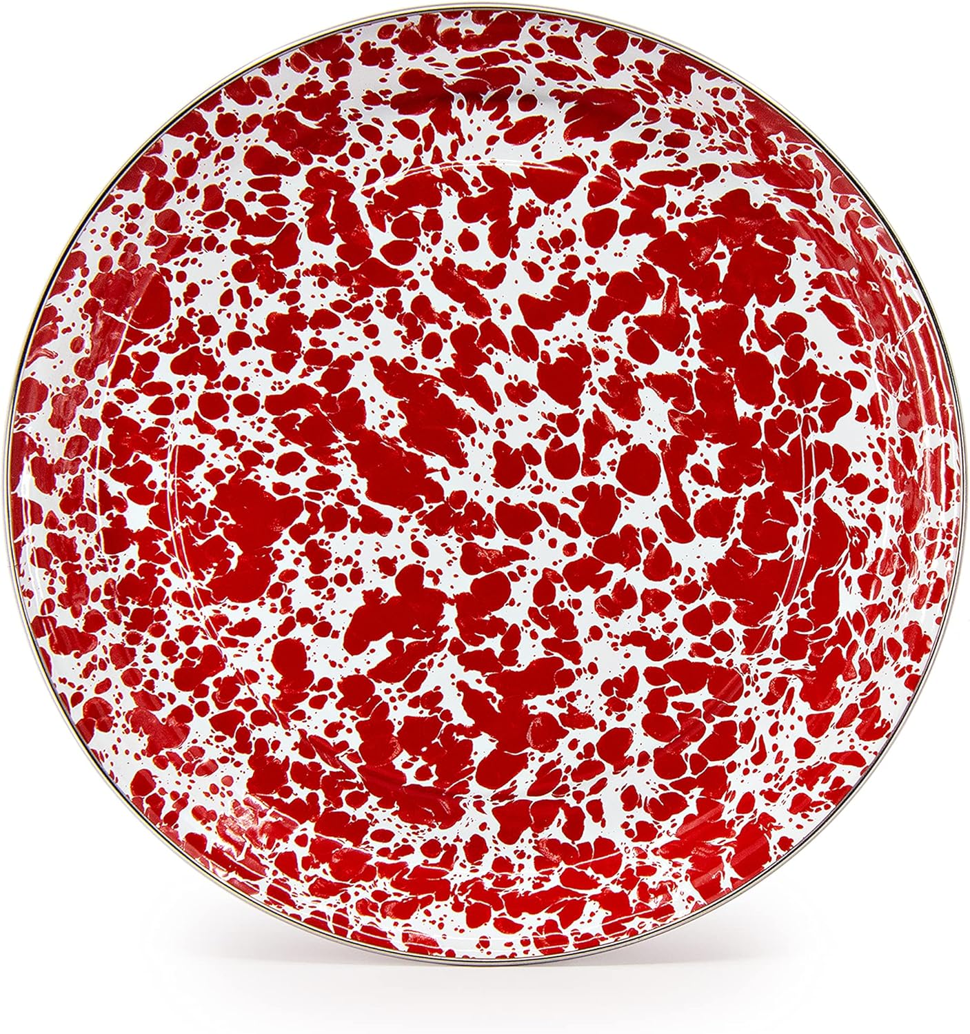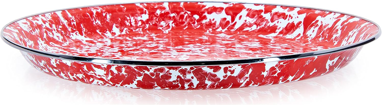 The item is a Golden Rabbit red swirl small tray. It’s 12 inches in diameter and 1.25 inches in height. The tray is made of steel with an elegant porcelain enamel finish. The stainless steel rim ads extra durability. Its oven and stove top safe, works with induction and is dishwasher safe and non-toxic.