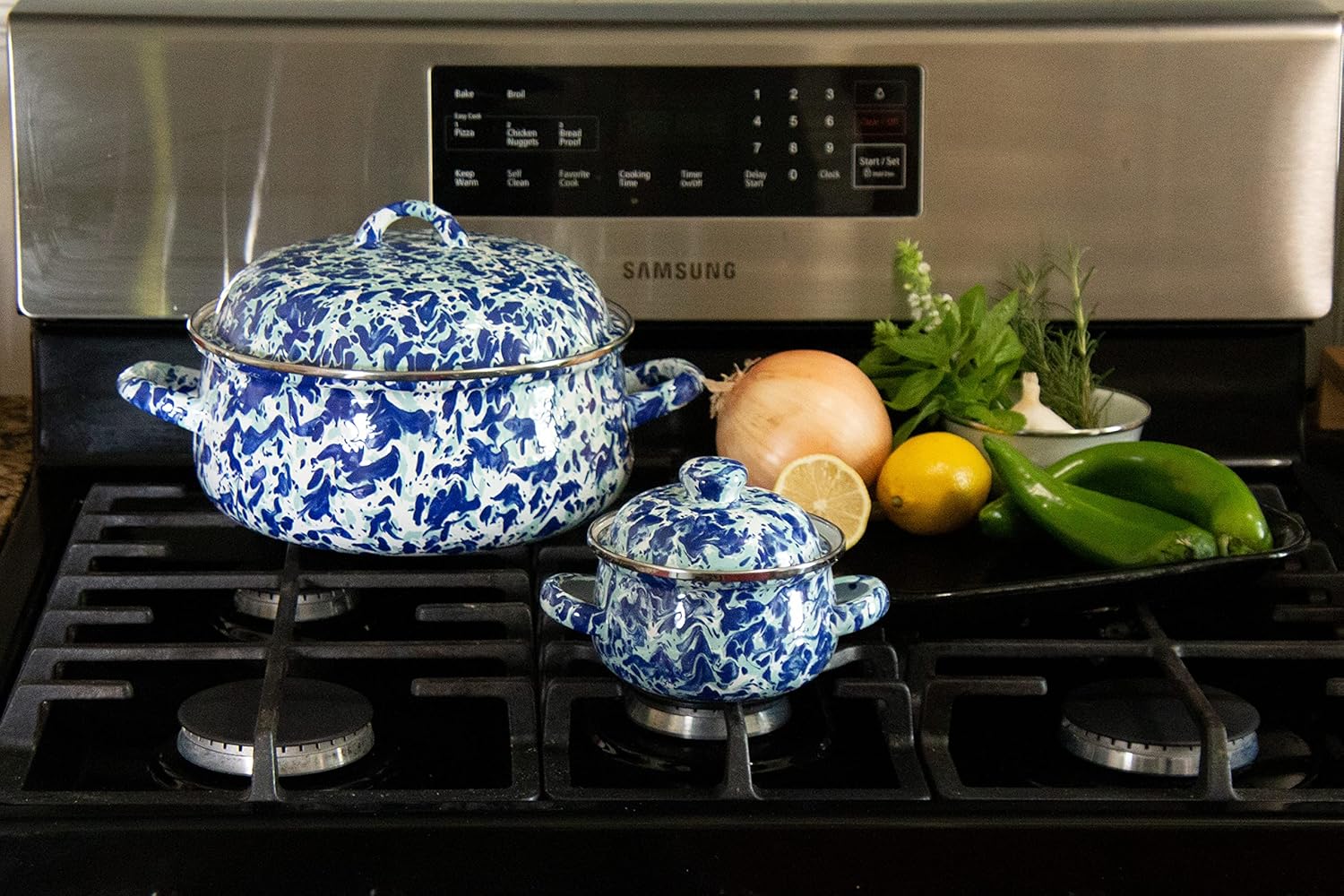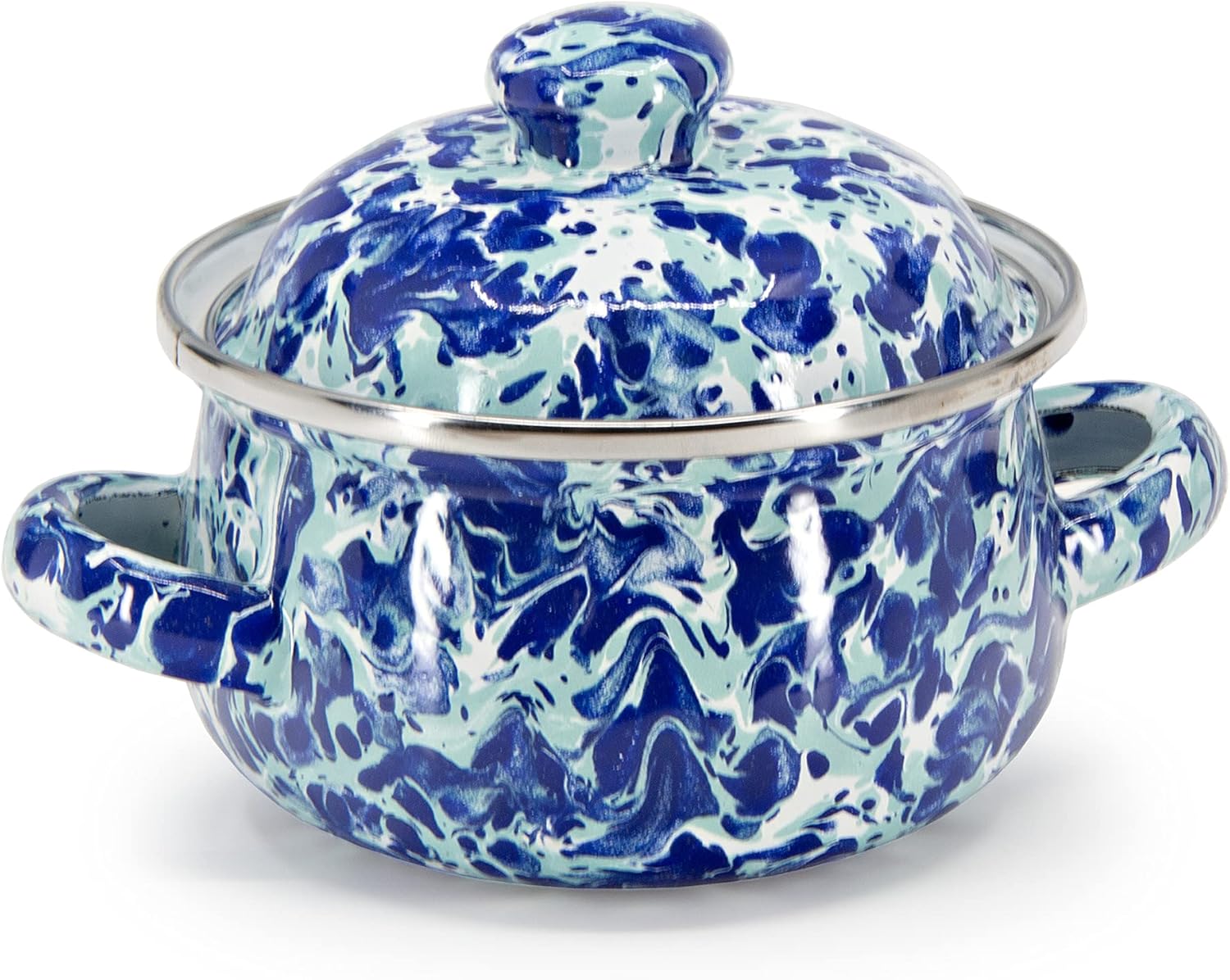 A set of 2 Golden Rabbit ocean swirl enamelware tureen bowls.  The bowls are 4.5" in diameter and 3.5" deep.  Each bowl has a 16 oz. capacity and has a stainless steel rim for extra durability.  Durable enough to use every day!