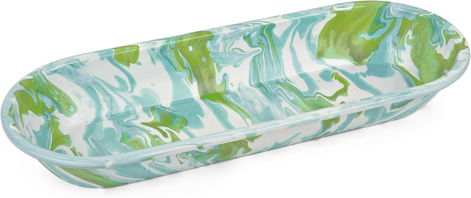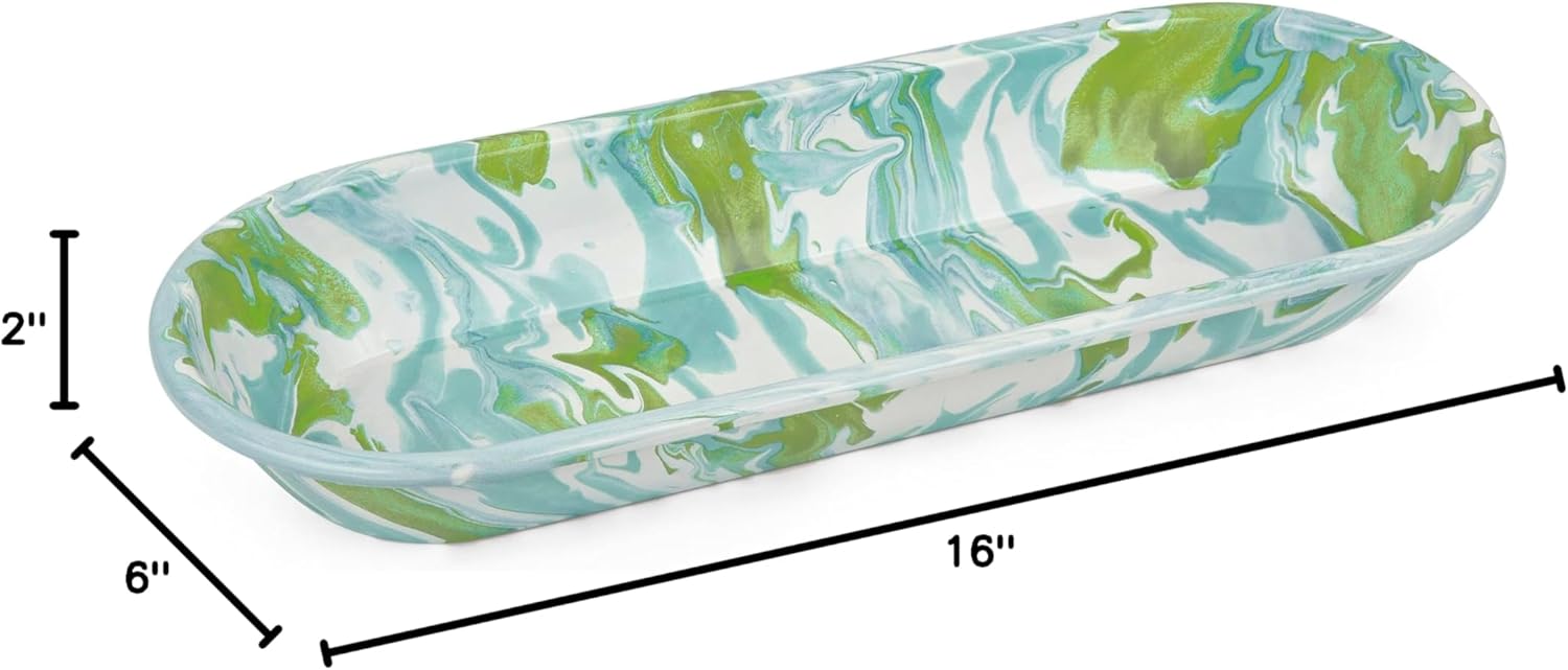 One Golden Rabbit Enamelware Modern Monet Green Marble Oval Bread Basket . This oval bowl has rolled edges like traditional enamelware. It measures 16" long, 6" wide and stands 1.75" high.