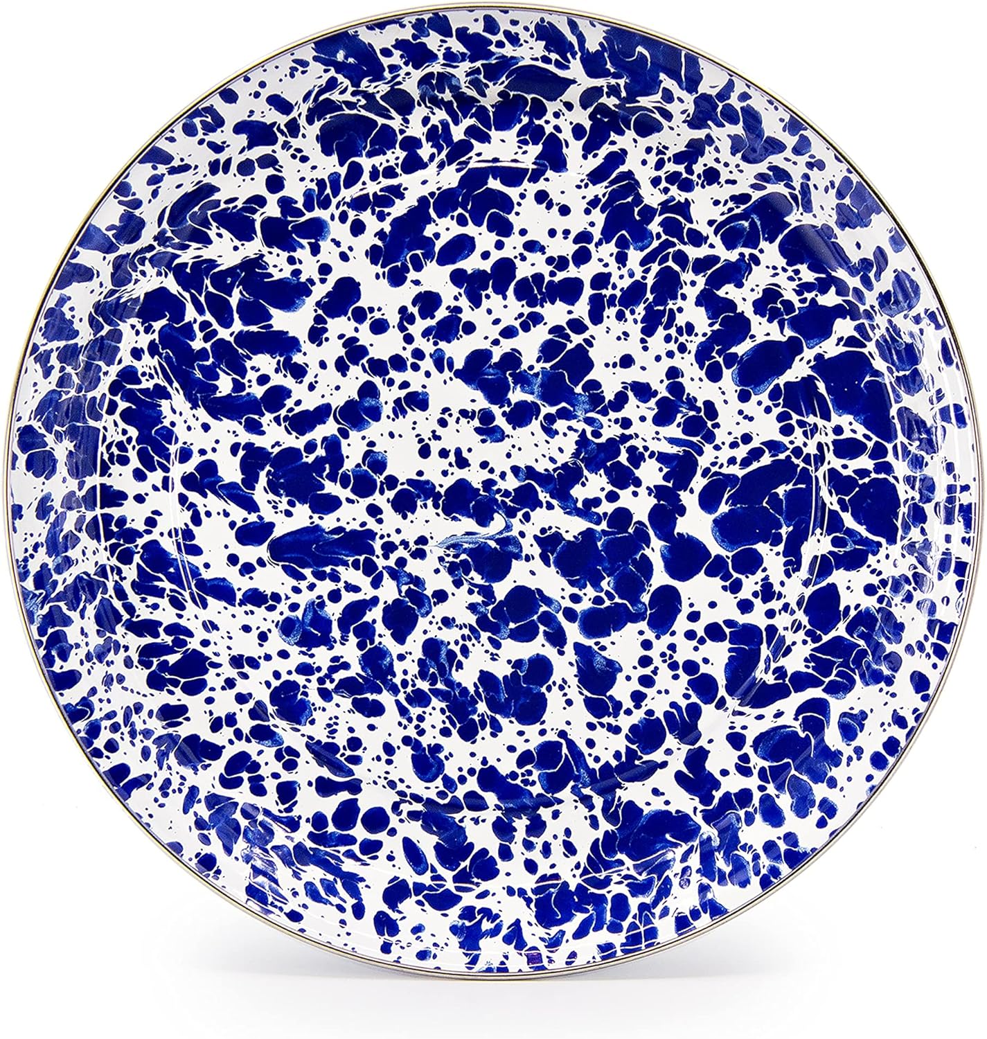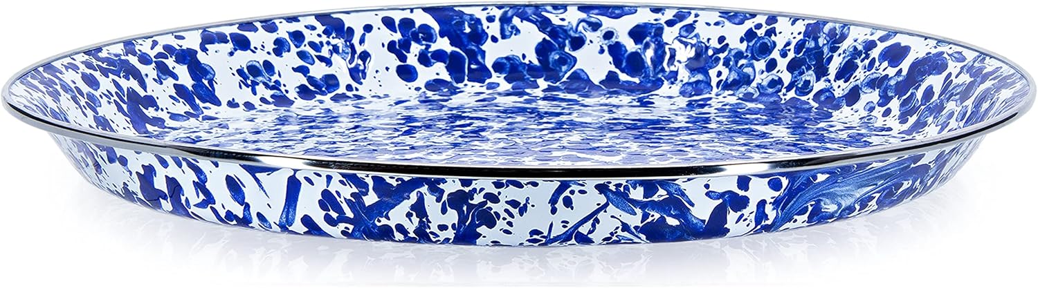 The item is a Golden Rabbit cobalt blue swirl small tray.  It’s 12 inches in diameter and 1.25 inches in height.  The tray is made of steel with an elegant porcelain enamel finish. The stainless steel rim ads extra durability.  Its oven and stove top safe, works with induction and is dishwasher safe and non-toxic.